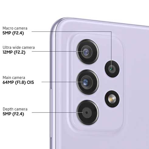Galaxy A52s 5G multi-lens camera system takes photos to the next level. Go ultra high-res on the 64MP Main Camera with OIS for crisp, clear photos throughout the day. Expand the viewing angle with Ultra Wide Camera. Customize focus with Depth Camera, or get closer to the details with Macro Camera.