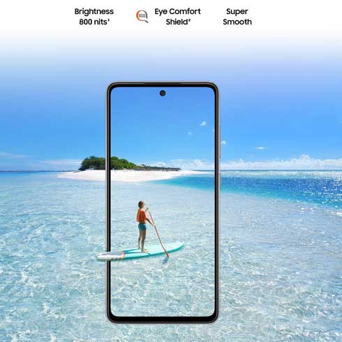 Feast your eyes on vibrant details with the FHD+ Super AMOLED display, reaching 800 nits for clarity even in bright daylight. Eye Comfort Shield lowers blue light, and Super Smooth keeps the view smooth, whether you're gaming or scrolling. All on the expansive 6.5-inch Infinity-O Display.